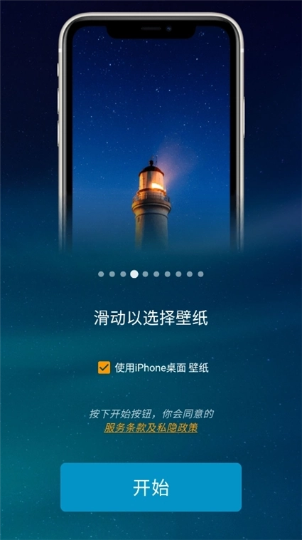1、安装,打开进入滑动选择壁纸,点击开始。