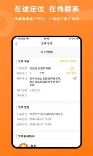3、在途定位与在线联系:支持快速查看客户实时定位,可一键拨打用户电话。