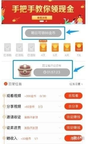 3、在好看视频平台,每日签到都能领取金币奖励,连续签到的天数越多,获得的金币数量也会相应增加!另外,开启宝箱有机会随机获取金币,宝箱的开启间隔为每4小时一次。