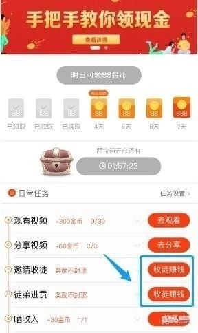 5、分享收徒链接邀请朋友注册,就能轻松赚取收益!点击链接领取现金红包后,直接选择“去提现”,跳转至好看视频App,对方将自动成为您的徒弟。成功收徒可获得5元现金奖励!徒弟每日完成任务时,师父还能收到徒弟贡献的金币。