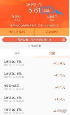 6、点击此处查看收支明细,系统每天6点会自动将昨日获得的金币进行兑换,兑换比例为1000金币兑换1元。当账户累计金额满10元时,即可申请提现。