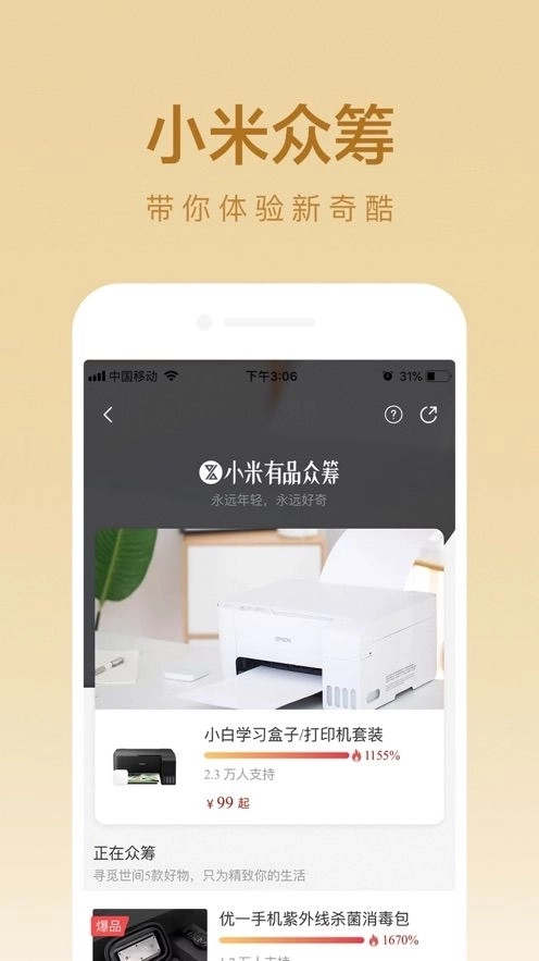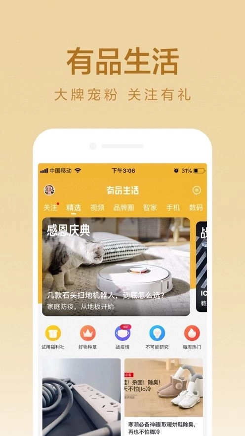 2、有品涵盖家电、家居、智能、影音、服饰、日用、餐厨、出行、文创等十余个品类,严格把控品质源头的同时,精简同品类产品数量,真正做到“好东西不用挑”。【小米众筹】也是有品平台的一大特色,智能科技前沿酷玩的产品为用户带来更多尝鲜体验。