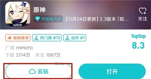 2.搜索并来到原神的游戏页,点击【云玩】