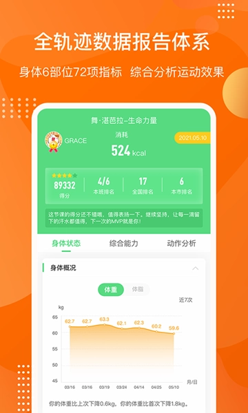 每上一节课,你都会获得本节课的运动规划报告。报告涵盖全身6部位72项指标综合分析,综合评估用户的体态、运动能力和运动姿态进行全面系列化评估分析,提供全场景、全过程、全轨迹的数据报告。