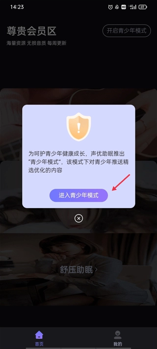 2、这时候会弹出一个提示,看完后就点击进入青少年模式。
