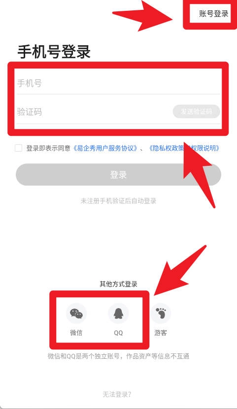 登录页面提供多种登录方式,包括手机号验证码登录、账号密码登录,以及微信、QQ第三方登录选项。