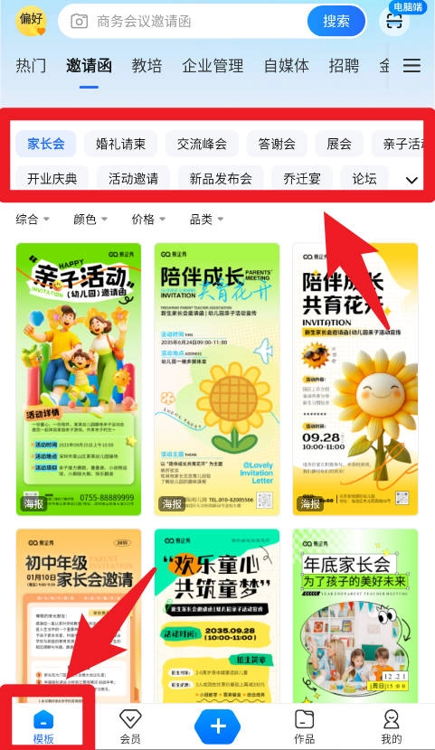 在模板分类里,你可以挑选婚礼请柬、家长会、答谢会、论坛这类主题模板,能满足不同场景的使用需求。