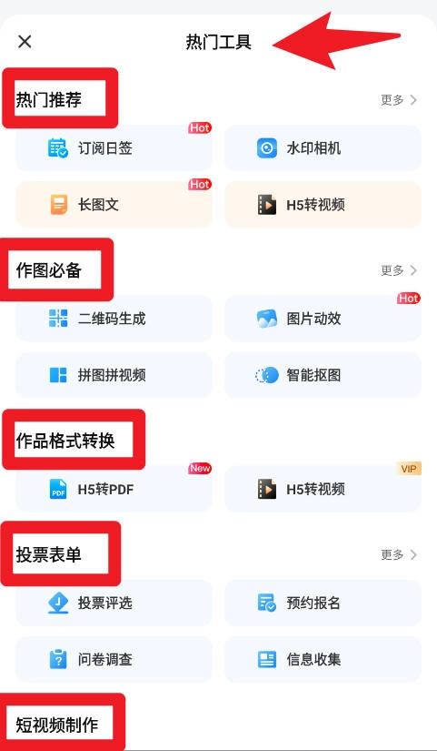 热门工具涵盖多种分类,具备二维码生成、图片动效、智能抠图等功能,助力创作更高效。