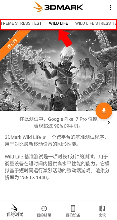 在本站下载并安装3DMark手机版,打开程序后,在界面上方选择我们想要测试的项目。