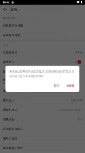 点击开启桌面歌词后,页面弹出了一个设置提示,提示需要开启网易云音乐的悬浮窗权限,于是我点击了设置按钮。