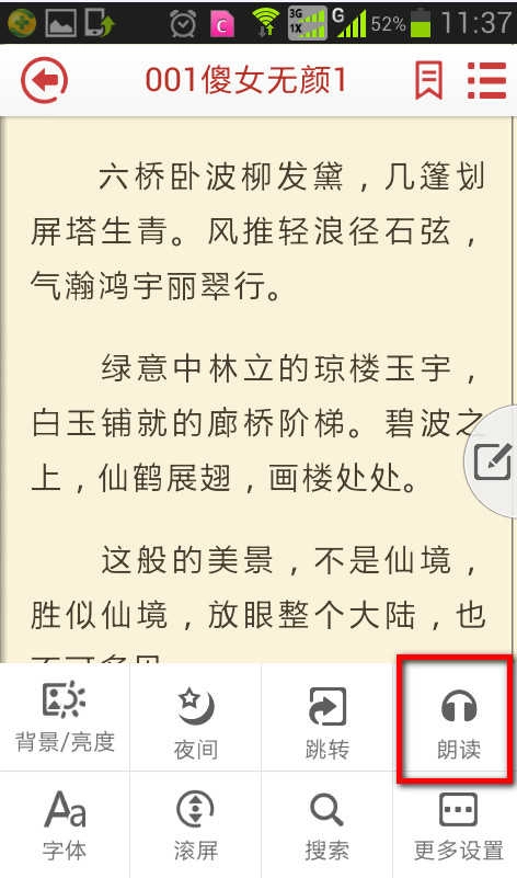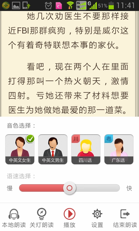 5、点击正在阅读的小说屏幕可以打开朗读设置工具菜单,在菜单中可以选择需要的功能,也可更改朗读声音和语速。