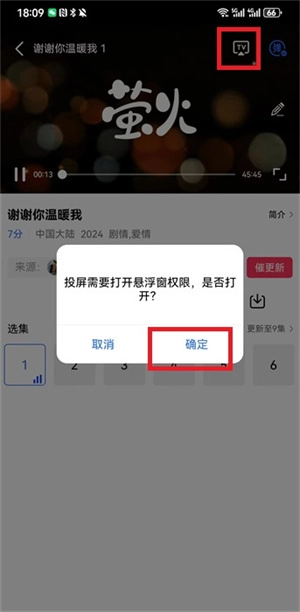 2、在界面里点击视频播放区域后,右上角会出现【tv】标志,点击该标志即可进行投屏操作,但需先完成授权步骤,点击【确定】按钮来授予软件相应权限。