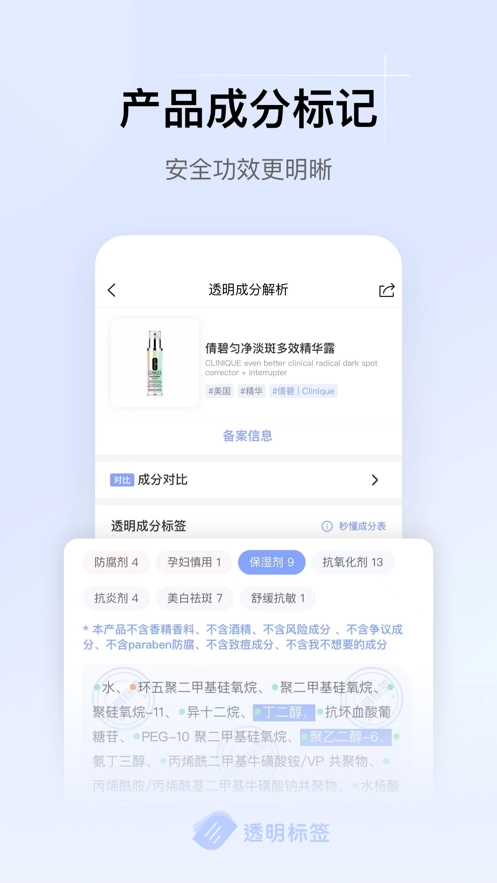 透明标签最新版是一款化妆品功效成分查询手机助手,帮助用户查看所有化妆品成分列表,包括那些难以识别的名称,轻松识别成分是否适合他们,并确定他们正在使用的产品是否包含任何潜在的有害成分,还提供了专业的美容建议和使用说明书,帮助用户使用化妆品。