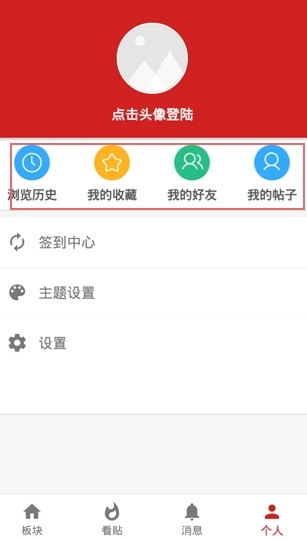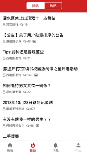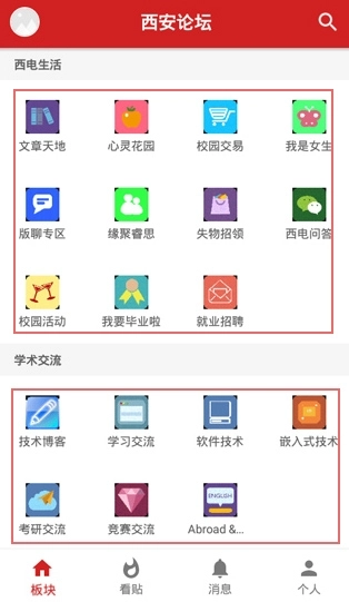 在本站安装西电睿思后,能看到板块、看贴、消息、个人这四个功能分区。