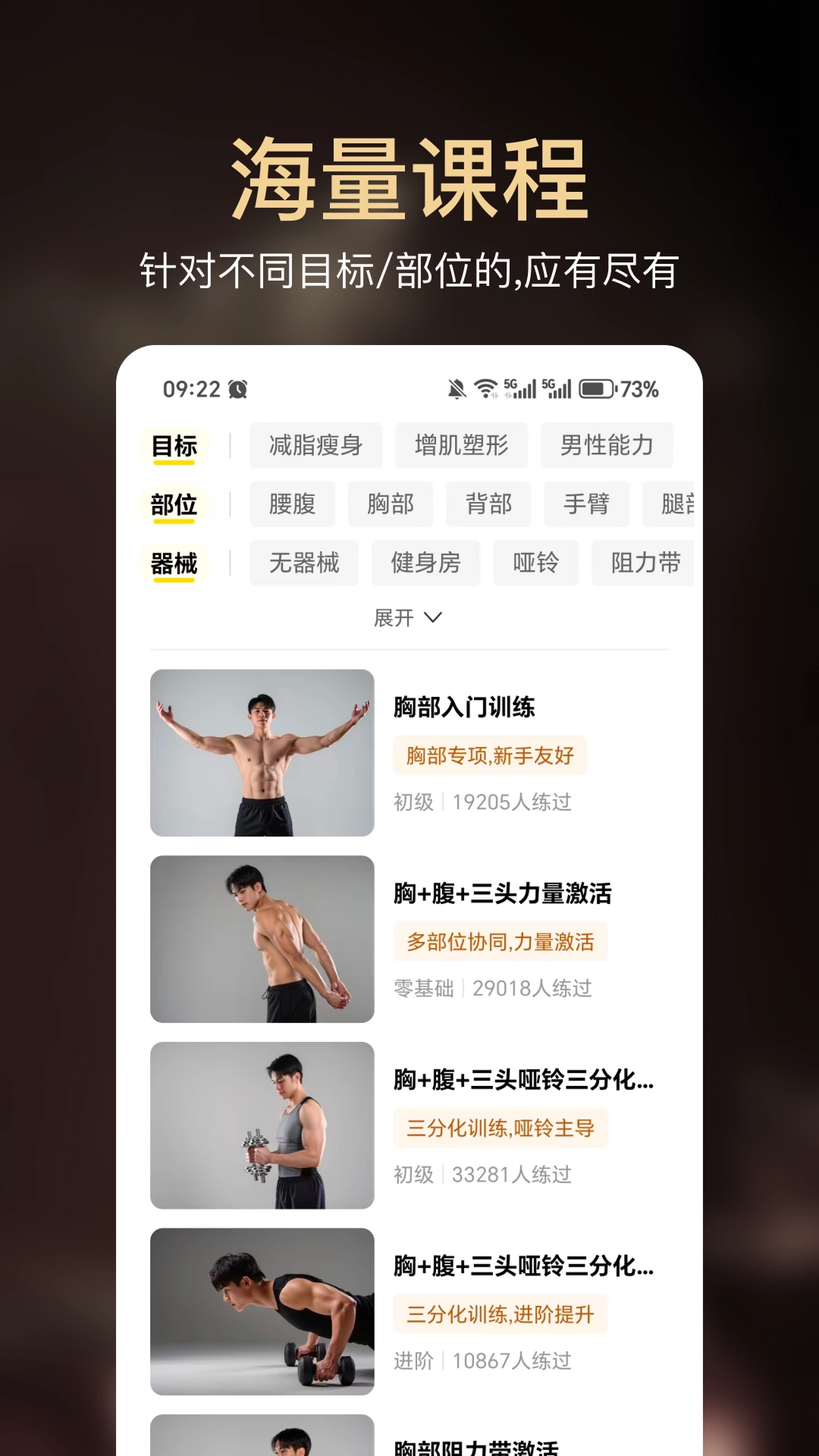 小白健身手机版是一款专业的健身教学软件,用户能在这里找到由专业健身教练针对不同器械、肌肉部位和用户群体设计的健身课程,这些课程分类清晰,方便用户根据自身需求挑选学习。软件内容覆盖全面,适用场景包括健身房、家庭、户外等,让用户锻炼不受时间和空间的约束,感兴趣的朋友不妨来体验一下。