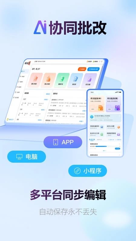 可以让你达成多端设备间的协同批改,助你实现人工协同,轻松完成作文与字词的批改工作。