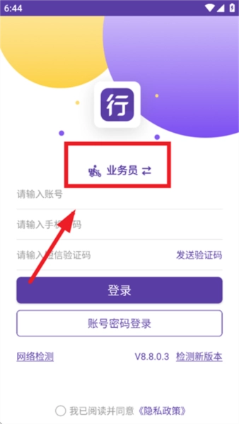 安装并启动圆通行者应用,进入登录界面后,点击图中所示的身份选择栏。