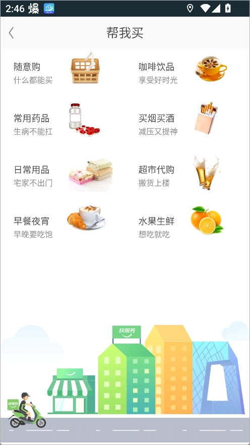 同城代买:早餐夜宵、啤酒烤串、水果生鲜、超市药店、各类急用,全城帮买,急速送达。