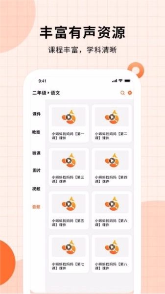 1、拥有丰富的有声资源,涵盖了视频、音频等类型的课件,种类也多样;