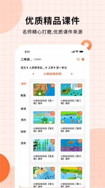 课件ppt拥有海量课件内容,涵盖了课前、课中和课后三个阶段,也按照该阶段提供了各种PPT、教案、图片、视频、音频等格式的课件,相应的可以解决用户的备课和讲课问题,也帮助用户更好的完成教学;在这里,用户可以按照需要的教材、课文、单元等,筛选到需要的课件资源,直接挑选课件进行使用,也减少了用户备课的麻烦,所以,想要轻松进行备课和教学,就可以使用该软件进行查询,让你便捷发现各种课件资源;除此之外,该平台还提供了各种生活、商业、活动等类型的PPT,也可以满足用户的工作和生活需求。