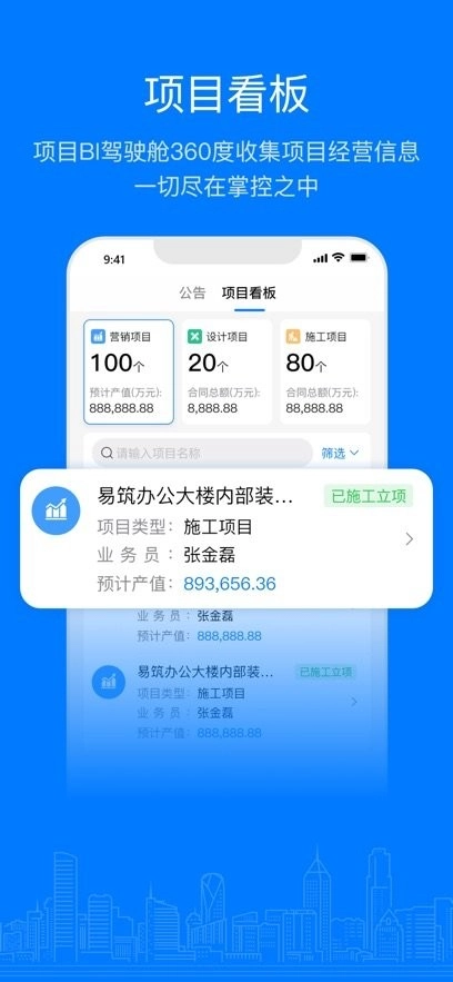 易筑运营是易筑网络科技(苏州)有限公司专门为工程施工企业打造的SaaS管理软件。依托多年行业管理经验与信息化建设实践,这款软件上线了200多个业务表单,能够对项目全生命周期进行管理,覆盖从营销跟踪到施工立项、设计到施工转化、施工到审计结算、业务到财务、项目经营到绩效考核的全流程。它以项目管理为核心,功能模块涵盖行政办公、人事、营销、设计、施工、法务、财务、报表管理以及数据分析等多个业务领域。
