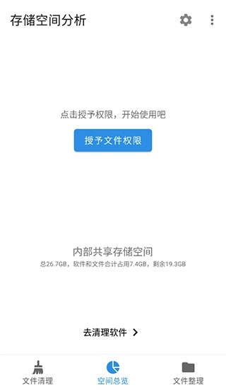 1、在安装爬爬资源好XB清理器后,打开该应用进入空间总览页面,点击“授予文件权限”按钮。