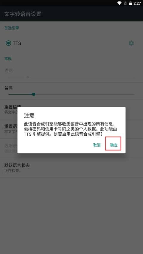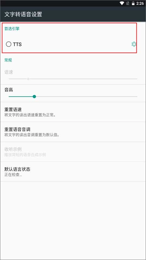 2、点击该功能后会自动跳转至文字转语音设置界面,在此之前请先准备好“小说tts语音引擎”,勾选“TTS”按钮,随后等待系统自动完成设置。