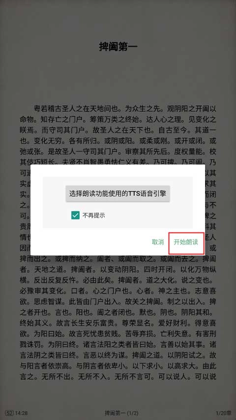4、再次点击返回键进入搜书大师的阅读界面,此时会弹出“选择朗读功能使用的TTS语音引擎”的小窗口,点击该窗口即可开始朗读。