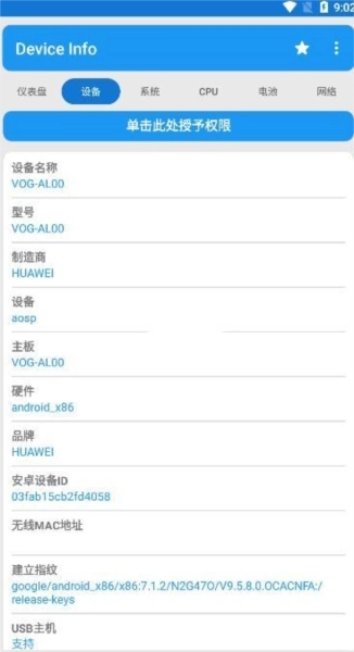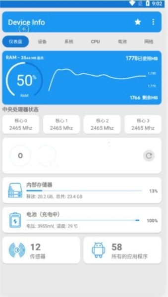 仪表板包含以下内容:RAM、内部存储、外部存储、电池、CPU、可用传感器、已安装的应用程序以及优化功能。