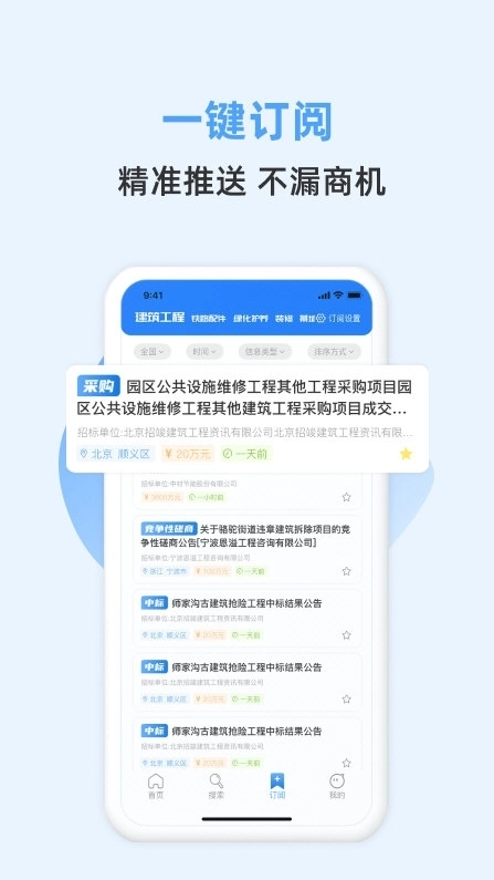 订阅功能支持按区域、城市、行业、关键词等维度进行定制化设置,精准锁定您关注的招标信息,助您一键快速把握潜在商机。
