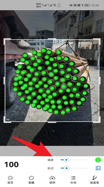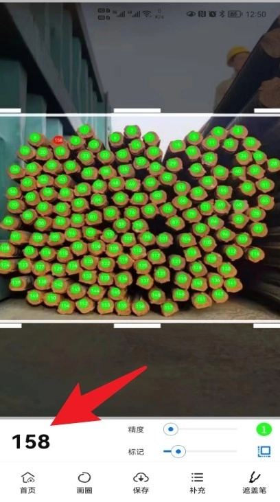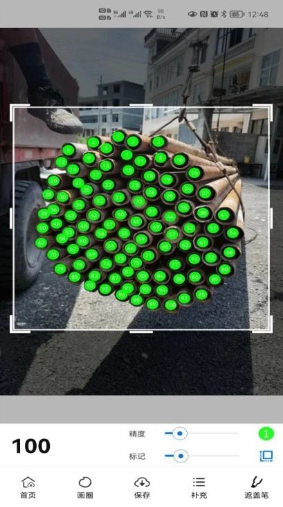 5、对钢管拍照后一秒钟即可自动完成上百根的点数,支持直接拍摄照片或从相册选取图片来识别钢材钢管的数量;