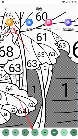 3、点击“提示”还可以在相应位置显示对应的颜色数字,可以根据提示快速填充颜色;