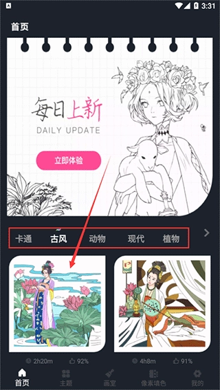 1、进入后,在首页选择画作的分类,然后选择一款您喜欢的作品;