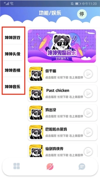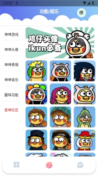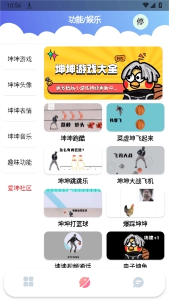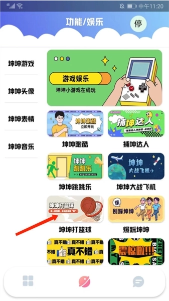 3、在功能/娱乐界面,涵盖坤坤游戏、坤坤头像、坤坤表情以及坤坤音乐等频道,用户能够依据个人喜好挑选体验内容,下面就以【坤坤游戏】为例进行说明。
