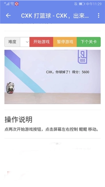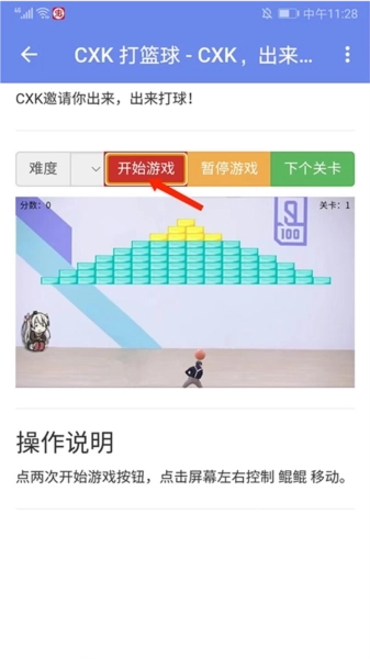 5、进入CXK打篮球游戏界面后,点击“开始游戏”按钮。游戏过程中,通过点击屏幕左右两侧来操控鲲鲲移动,利用顶撞篮球的方式消除画面中的方块就能获取分数。