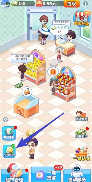 首次提现需要超市达到一级,并且拥有3000劵,我们点左下角的『引导任务』增加几个货架就可领取几千劵。后续还想再升级拿更多红包的建议打开右下角的『自动服务』功能,这样省力很多。