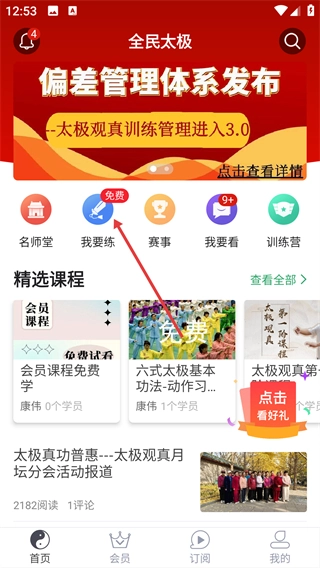 1、打开“全民太极”首页后,点击【我要练】功能入口,就能进入训练管理页面,在此可以查看修炼数据以及课程列表。