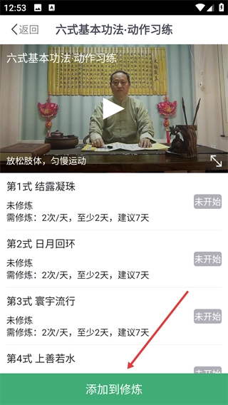 4、在动作习练页面,能查看各招式的修炼要求,点击底部的【添加到修炼】按钮,即可把该课程添加到个人修炼计划中。