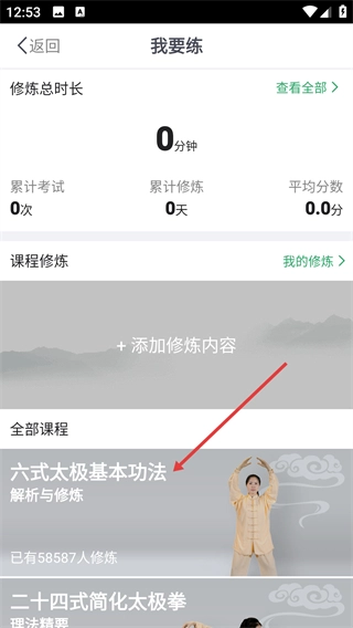 2、在“我要练”页面的所有课程里,找到并选择【六式太极基本功法-解析与修炼】这一课程,随后进入该课程的详情页面。