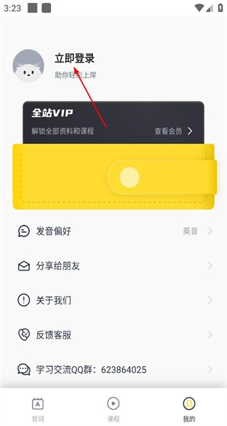 1、启动软件后进入背词界面,浏览词书选择等相关板块,随后点击“我的”选项,进入个人中心的功能页面。