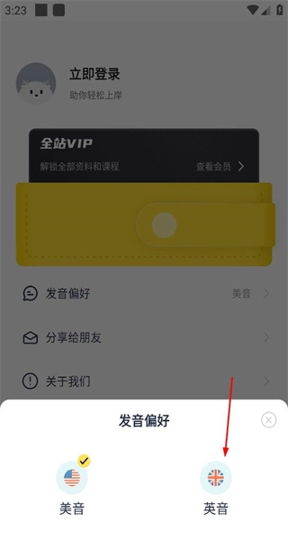 2、进入个人中心页面,找到发音偏好选项,点击后切换为英音,完成发音方式的设置操作。
