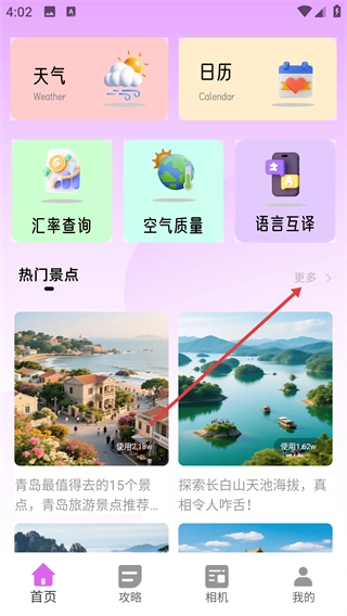 1、在首页的“热门景点”板块中,点击右侧的【更多】按钮,即可进入景点推荐的完整列表页面。