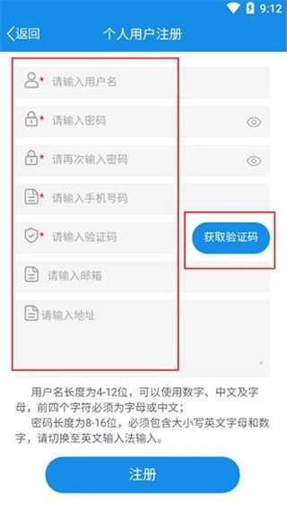 3、在注册页面填写完整的注册信息和验证码后提交注册,之后回到登录界面输入账号信息就能完成登录。