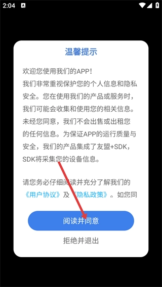 1、打开后,仔细阅读关于个人信息与隐私安全的温馨提示,以及《用户协议》和《隐私政策》,然后点击【阅读并同意】按钮。