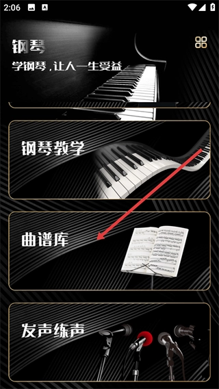 进入主界面后,点击【曲谱库】选项,进入曲谱资源浏览页面,即可查找各类钢琴曲目对应的曲谱。