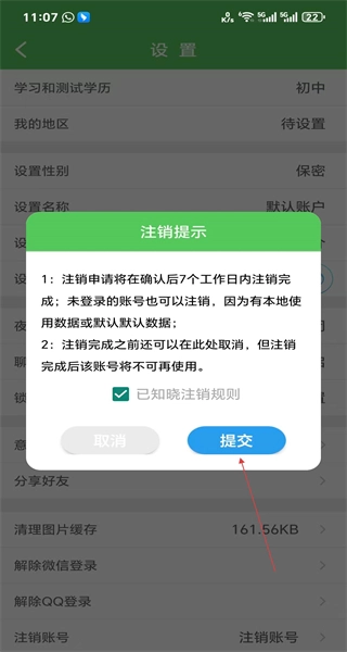 4、查看注销提示内容,勾选已知晓注销规则选项,点击提交按钮,提交账号注销的申请。