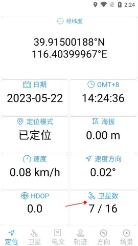 2、软件首页会开启定位功能,您可在右下角查看搜索到的卫星以及参与定位的卫星。