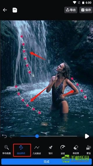 3、点击底部的【图片流动】选项,随后点击底部的【自由路径】,在图片区域绘制动画路径。