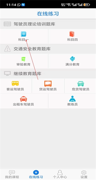 打开软件后,进入“我的课程”页面,查看科目一理论课程列表,点击底部的“在线练习”选项,即可进入题库选择页面。