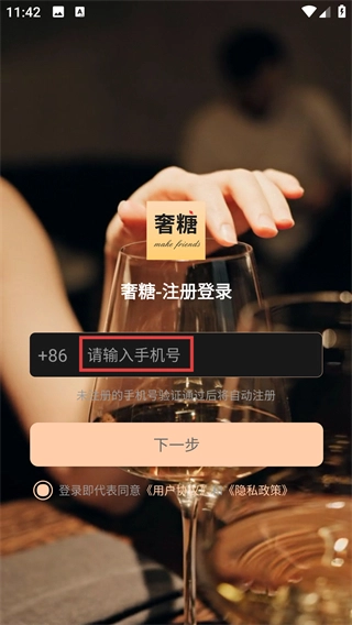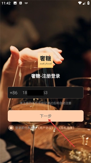 1、在“奢糖”应用的注册登录界面,首先填写【请输入号】,未注册的号验证通过后会自动完成注册。